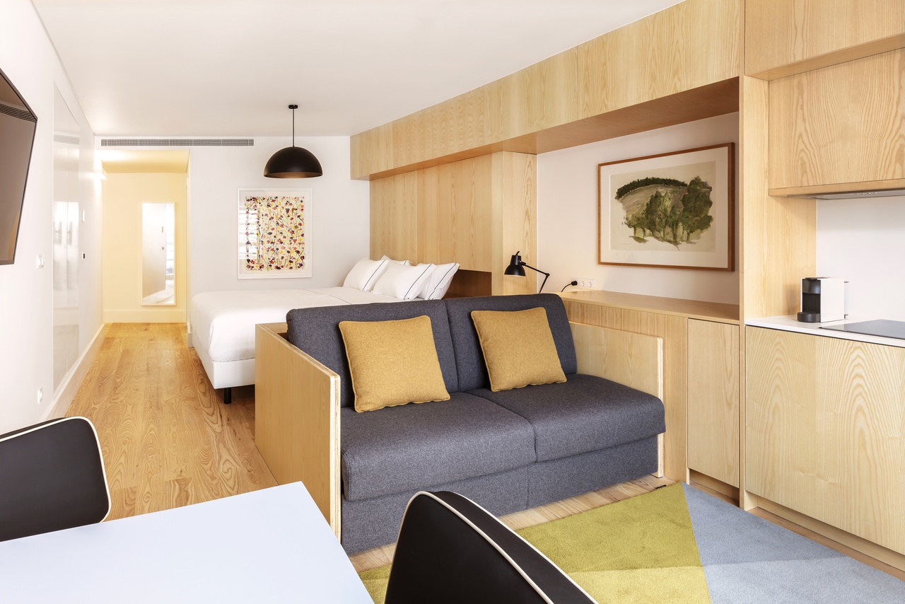 Um estúdio superior (T0) com 35 m2, que apresenta uma decoração contemporânea em tons claros e madeira de freixo, totalmente equipado, com cama king size ou duas camas individuais, kitchenette com zona de refeições, ampla casa de banho privativa com chuveiro, zona de estar com um sofá-cama e secretária.