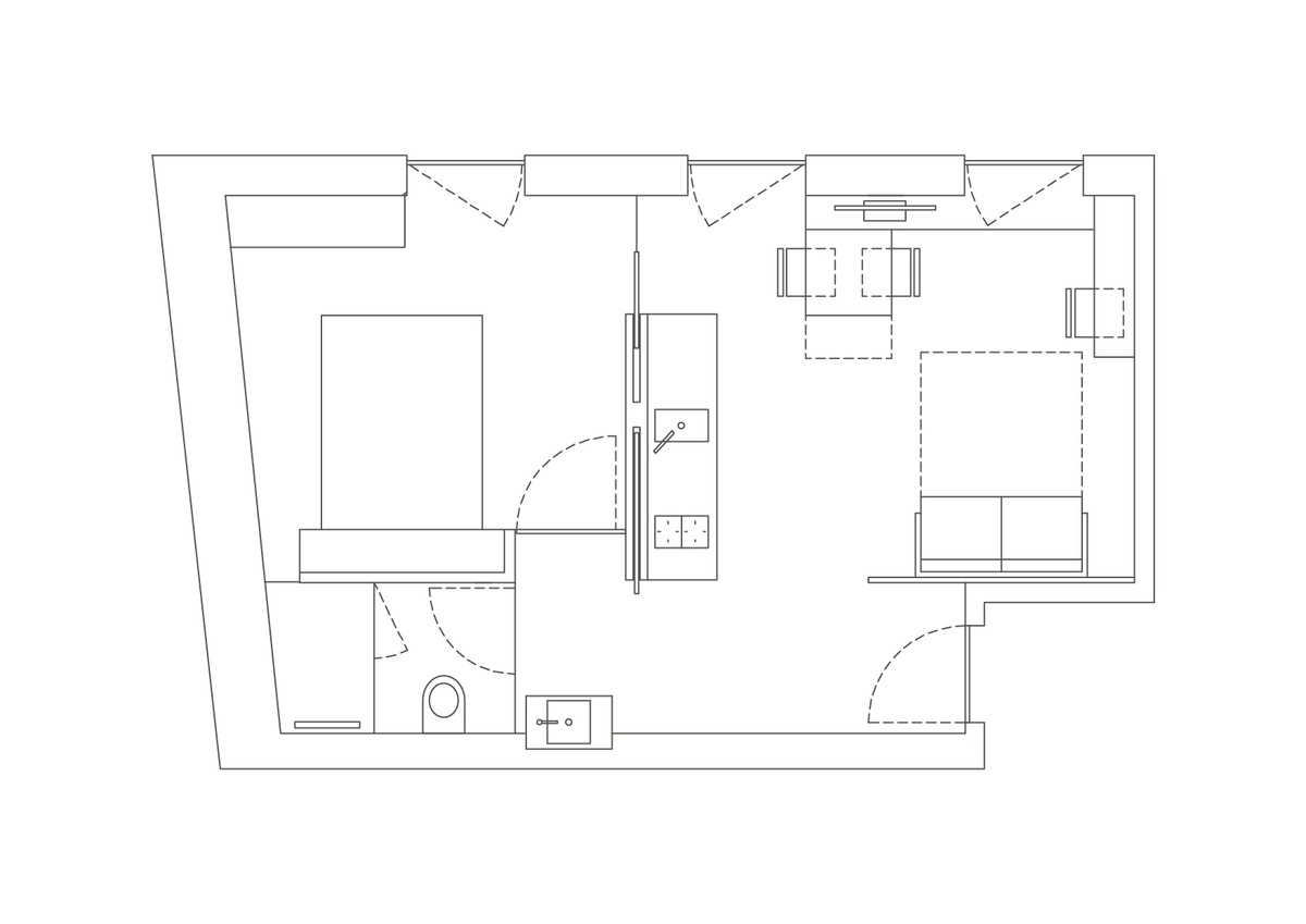 Um apartamento superior (T1) com 42 m2, que apresenta uma decoração contemporânea em tons claros e madeira de freixo, totalmente equipado, com cama king size ou duas camas individuais, kitchenette com zona de refeições, ampla casa de banho privativa com chuveiro, zona de estar com um sofá-cama e secretária.